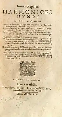 Harmonices mundi (La armonía del mundo, 1619) es un libro escrito por Johannes Kepler en la ciudad de Linz. El libro contiene la primera formulación de la tercera ley del movimiento planetario.