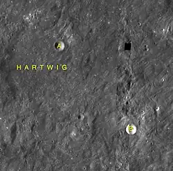 Por convención estas características se identifican en los mapas lunares colocando la letra en el lado del punto medio del cráter que está más cercano a Hartwig.