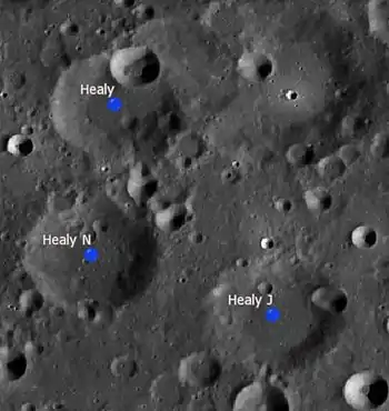Healy es un cráter de impacto que se encuentra más allá de la extremidad noroeste de la Luna, en la cara oculta del satélite. Está situado al sureste de la llanura amurallada del cráter Landau, y al oeste de Lorentz, otra llanura amurallada.