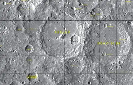Heaviside es un gran cráter de impacto que se encuentra en la cara oculta de la Luna, unido al borde oriental de la llanura amurallada igualmente grande de Keeler, aunque Keeler aparece algo menos erosionado. Al noroeste se halla el cráter Stratton, y al sureste aparece el prominente cráter Aitken.