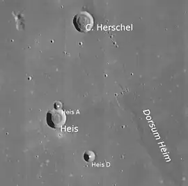 Heis es un pequeño cráter de impacto lunar que se encuentra en la parte occidental del Mare Imbrium, al noreste del cráter Delisle, y al sur de C. Herschel. Se trata de una formación circular, simétrica, con un suelo interior que es aproximadamente la mitad del diámetro del borde exterior. El pequeño cráter satélite Heis A penetra ligeramente en el borde norte, dándole una forma característica similar a un "8".
