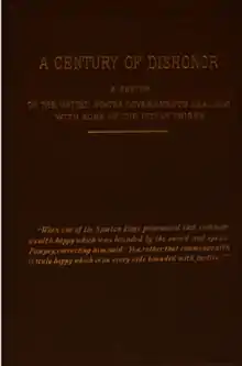Jackson escribió un libro, el primer publicado bajo su nombre propio, en que condenó las políticas indias a nivel estatal y federal, recapitulando una historia de tratados rotos. Un Siglo de Deshonor (1881) pidió reformar significativamente la política gubernamental hacia los nativos americanos.[14] Jackson envió una copia a cada miembro del Congreso con una cita de Benjamin Franklin que imprimió en rojo en la cubierta: "Mirada vuestras manos: están manchadas con la sangre de vuestros parientes."[15] The New York Times, aun así, sugirió lo siguiente en el obituario de Jackson: