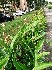 La planta ave del paraíso (Heliconia latispatha)[1] es una especie de la familia Heliconiaceae. Es una planta. Es una planta de hasta 2 metros de alto, con hojas largas y puntiagudas, inflorescencia erecta, las flores nacen en diferentes direcciones con brácteas delgadas naranja a rojo y flores amarillas a verde amarillentas. Habita desde el sur de México hasta Centro América pero es ampliamente cultivada por su belleza ornamental.[2] En estado natural son polinizadas por los colibríes.