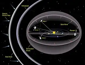 Es un límite teórico aproximadamente circular o en forma de lágrima, que señala el límite de influencia del Sol. Se localiza en el punto en el que la pérdida de presión del viento solar, causada por la dispersión inherente a su difusión radial, iguala a la presión exterior del medio interestelar. Una buena visualización casera de este efecto se obtiene en un fregadero donde el chorro de agua crea una zona de difusión laminar en torno al punto en el que toca el fondo. El tamaño de esta zona varía según el caudal y la presión del agua encharcada.