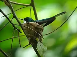 Su nido tiene forma cónica; es construido principalmente con pelusa vegetal y poco musgo o líquenes; se ubica a una altura de 6 a 20 m del suelo, cerca de la punta de una rama delgada.[3] La hembra pone dos huevos blancos.[4]
