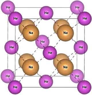 El Na2He tiene una estructura cristalina cúbica, que se asemeja a la fluorita. A 300 GPa, el borde de una celda unitaria del cristal tiene a = 3.95 Å (ängströms). Cada celda unitaria contiene cuatro átomos de helio en el centro de las caras y esquinas del cubo, y ocho átomos de sodio a coordenadas de una cuarta parte de cada cara. Los electrones dobles (2e−) se ubican en cada borde y en el centro de la celda unidad.[note 1] Cada par de electrones está emparejado por rotación. La presencia de estos electrones aislados lo convierte en un electruro. Los átomos de helio no participan enlaces. Sin embargo, los pares de electrones se pueden considerar como un enlace de dos electrones de ocho centros.