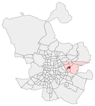 Localización del barrio de Hellín en el distrito de San Blas-Canillejas (rosa) y el municipio de Madrid (gris)