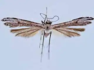 Su envergadura es de 13 a 16 mm. Las antenas tienen rayas longitudinales de color marrón oscuro y negro en una basal de color marrón oscuro de fondo. Hay escalas de colores en el tórax, éstos son basales de beige, apical marrón grisáceo y blanco lateralmente en el ápice. Las alas delanteras son en su mayoría de basal pálido con color marrón claro y apicalmente con escalas de marrones más oscuros, y pura escala de blancos. Las alas posteriores y sus márgenes son marrón grisáceo.[2]