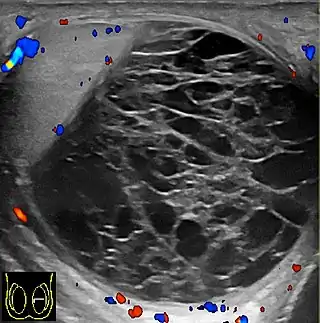![]() Ecografía escrotal de un hematocele, un par de semanas después de su aparición, como un volumen líquido con múltiples tabiques gruesos. El hematocele no muestra flujo sanguíneo en la ecografía Doppler. Un piocele tiene una apariencia similar, pero fue descartado por falta de inflamación. | ||