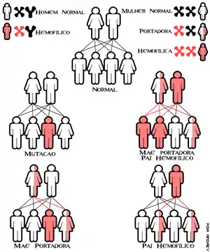La hemofilia es un trastorno hemorrágico hereditario en el cual la sangre no se coagula de manera adecuada. Esto puede causar sangrados tanto espontáneos como después de una operación o de tener una lesión. Está relacionada con el cromosoma X en los dos principales tipos: la hemofilia A, cuando hay un déficit del factor VIII de coagulación y la hemofilia B (enfermedad de Christmas) cuando hay un déficit del factor IX de coagulación. Casi en todos los casos esta enfermedad es recesiva para las mujeres, pues si alguno de los padres es hemofílico el otro cromosoma heredado vendrá de un padre sano. Este no es el caso de los hijos varones pues en ellos existe una alta probabilidad de heredar el cromosoma X enfermo.
