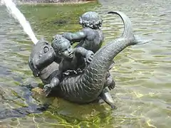 - Fuente de bronce en la mansión Miramar (1915). La fuente escultural está instalada en el jardín de la entrada frente a la fachada principal de estilo neoclásico francés en la Bellevue Avenue , Isla Aquidneck - en Newport (Rhode Island).[8] 41°27′30″N 71°18′17″O