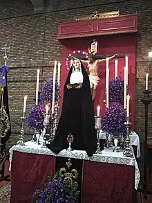 ICONOGRAFÍA: Representa a la Virgen María en la soledad del Monte Calvario. Levanta entre sus manos la corona de espinas, símbolo del dolor humano santificado por los dolores divinos de Jesucristo. Fija los ojos en el cielo en oración de sublime ofertorio al Padre Celestial por todas las madres que sufren. No llora, porque es la expresión de un dolor orante iluminado de esperanzas celestiales. La virgen viste de riguroso luto, sólo destacando el rostrillo que es blanco. Manto y saya de terciopelo negro sin bordar. Corona de aro con 12 estrellas realizada por Emilio Landa