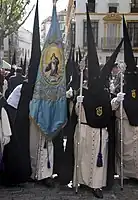 | Túnica | Nazarenos de ambos cortejos:[4] Capa y capirote negros. Túnica color crema. Cíngulo y botonadura morados. | |
