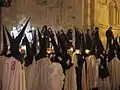 El atuendo es una túnica y caperuz de raso negro y una capa blanca de raso con el escudo de la cofradía bordado en rojo. Cada cofrade lleva un hachón con una vela. En la actualidad tiene unos 1800 hermanos y tiene las listas abiertas, es decir, cualquier bautizado puede pertenecer a ella.