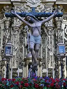 El paso de Cristo es de estilo neobarroco, dorado e iluminado por candelabros de guardabrisas. El ángel que soporta la caída de la cruz se hizo en 1995. El Señor lleva potencias de oro realizada en 1950.