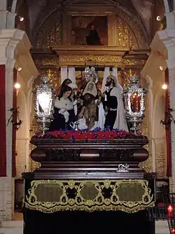 ![]() Paso de la Sagrada Mortaja preparado para su salida procesional en la que fue su sede, la Iglesia-Oratorio de San Felipe Neri | ||