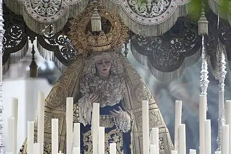 Fue restaurada en 1985.[1] En 2005 estrenó un manto bordado en oro, y en 2008 el faldón delantero del paso. La Virgen lleva corona en plata dorada. El palio es acompañado en su estación de penitencia por la banda de música de Nuestra Señora del Águila, de Alcalá de Guadaíra.