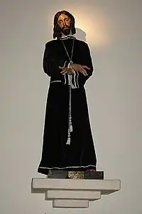 El Santísimo Ecce Homo es una escultura de madera policromada, de tamaño natural. De las conocidas de pijama, se ideó para ser vestida, como así procesiona. Es obra del escultor sevillano Antonio Illanes, realizada en 1944. De ese mismo año y autor son las imágenes de Pilatos y el soldado romano que es de talla completa. Se ideó el Misterio como el antiguo, con una barandilla, donde se apoyaba el gobernador romano.