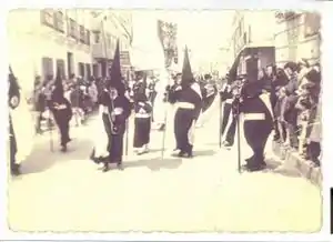 La formación de esta Hermandad data de 1800 no teniendo datos exactos, aunque algunos datos nos sitúan, tales como una pareja de escudos del 1805, su nombre era "HERMANDAD DEL SANTO SEPULCRO", estaba compuesta por 33 hermanos por ser ésta la edad de Cristo. Su atuendo consistía en una túnica negra, con un cordón blanco en la cintura. Los hermanos llevaban en procesión el Cristo en andas -sin sepulcro-, custodiándolo en su Capilla, hoy ermita de San Blas, hasta el año 1809 en que fue demolida por los franceses.