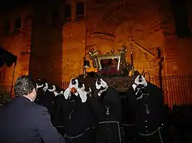 La mantilla que cubre al Cristo, también durante la procesión, fue una donación de Dª. Mercedes de Forcallo, esposa de D. Agatino Chacón, Marqués de Salinas, corresponde a la que ella lució el día de su boda en el año 1892.