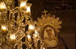 - Trono de la Virgen de orfebrería realizado por Seco Velasco en el año 1950. Manto de terciopelo negro bordado por la Adoratrices (1922), palio bordado por Fernández y Enríquez sobre malla.