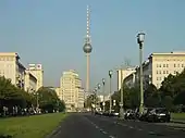Karl-Marx-Allee, hacia Strausberger Platz. Al fondo se puede ver la Torre de telecomunicaciones de Berlín en Alexanderplatz (el diseño inicial de la torre fue realizado por Henselmann)