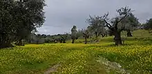 • Pastizal: Ocupa una superficie de 205Ha. que se localiza principalmente en la zona Sur del término municipal (Altos del Cuervo). En general se trata de pastos escasos y pobres, situados sobre tierras ácidas muy degradadas y erosionadas, que permanecen encharcadas gran parte del invierno por tener a escasa profundidad una capa impermeable. Las especies que lo pueblan son muy variadas, siendo las más significativas entre las leguminosas: Anthyllis lotoides, Caronilla dura, Lathyrus angulatus, Lotus conimbricensis y diversos Trifolium (subterraneum, tomentosum, angustifolium, arvense, etc). Entre las gramíneas se encuentran la Avena sterilis, Bromus rubens, Poa bulbosa, Vulpia bromoides, Gaudinia fragilis y otras. Asimismo existen otras especies como Plantago bellardi, Helianthemum guttatum, Euphorbia exigua, Rumex acetosella, Filago gallica, Diplotaxis catholita, etc. Al ser pastos pobres, el aprovechamiento fundamental es a base de ganado ovino y caprino, siendo la carga estimada de una oveja por Hectárea. y año. No obstante, en verano (de julio a octubre) hay que ir a las rastrojeras y en invierno (diciembre y enero) se hace necesario darles un suplemento a base de paja. Normalmente tan sólo durante 3 meses al año se puede decir que el pastizal es suficiente para alimentar el ganado. Respecto al ganado vacuno, la carga ganadera es de 0,05 U.G.M/ha y año.