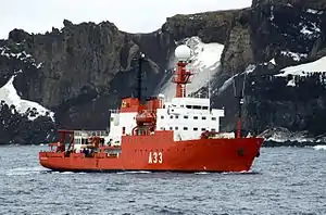 ![]() B.I.O. Hespérides (A-33) en la Isla Decepción en enero de 2013. | ||