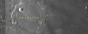 Hevelius es un cráter de impacto lunar con un brocal de escasa altura, situado en el extremo occidental del Oceanus Procellarum. Debe su nombre al astrónomo Johannes Hevelius. El cráter más pequeño, aunque muy visible, Cavalerius está unido al borde norte por crestas bajas. Al sur de Hevelius aparecen los cráteres Lohrmann y Grimaldi, este último de color más oscuro.