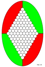 ![]() Diagrama de un tablero de hex de tamaño 11x11 sin ninguna casilla ocupada. Se distinguen con distinto color los laterales. |
