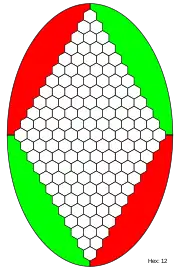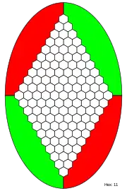 ![]() Diagrama de un tablero de hex de tamaño 11x11 con una partida terminada. Las negras han formado una línea que conecta sus laterales (sombreados en negro) y ganan. |