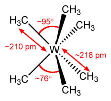 Como se muestra en la figura de la izquierda, el prisma trigonal ideal o D3h en el que todos los seis carbonos son equivalentes se distorsiona para dar el C3v estructura observada por Seppelt et al. mediante la apertura de un triplete de grupos metilo (triángulo superior) a una mayor los ángulos de la CAQ (94-97 °) con longitudes de enlace C-W un poco más cortas, mientras que el cierre la otra tripleta (triángulo inferior) con ángulos más cerrados 75-78 º y longitudes de enlace más largas.