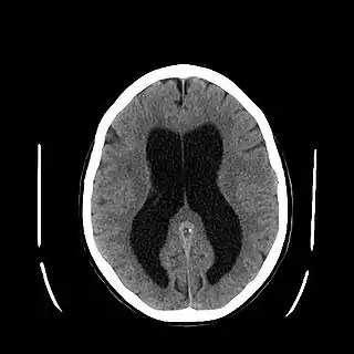 ![]() Tomografía computada mostrando acumulación del líquido cefalorraquídeo: zona hipodensa (oscura). | ||