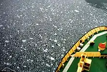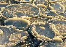 El hielo panqueque es una forma de banquisa que consiste en trozos redondos de hielo con diámetros que van desde los 30 cm a 3 m, dependiendo de las condiciones locales que afectan la formación del hielo. Puede tener un grosor de hasta 10 cm.[1] El hielo panqueque presenta bordes elevados que se forman al amontonarse el hielo frazil, hielo aguanieve, etc. por los bordes de los hielos panqueque cuando chocan, tanto debido a choques aleatorios entre sí como a las compresiones periódicas en la parte baja de las olas. Estos bordes son los primeros indicios de cuando comienza a formarse el hielo panqueque a partir de otras formas de hielo menos fusionadas.[2]