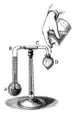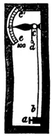 Se compone de un cabello humano de ocho a diez pulgadas (entre 20 y 25 cm) de largo, b c, Fig. 37, fijado en un extremo a un tornillo, y en el otro, que pasa sobre una polea, c, es tensado por un hilo de seda del que pende el peso, d. La polea está conectada a un índice que se mueve sobre una escala graduada (e-e'). El instrumento se puede hacer más sensible mediante la eliminación de los aceites del cabello, sumergiéndolo previamente por ejemplo en éter etílico.[4]John William Draper. Libro de texto de Química