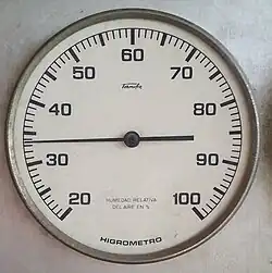 | Dial de un higrómetro de bobina metálica y papel impregnado de sal con escala lineal | |