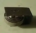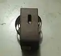 | Vista del mecanismo con la bobina de dilatación higroscópica, y detalle de la cara exterior de la bobina metálica con el papel impregnado de sal | |