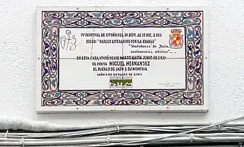 ![]() Placa conmemorativa de la estancia de Miguel Hernández en Jaén capital (casa n.º 9 de la antigua calle La Llana, actual Francisco Coello, n.º 9), en la que escribió el poema Aceituneros. | ||