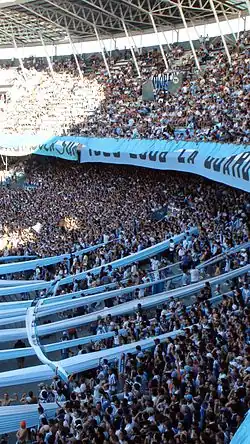 Un gran sector de este conjunto ha sido responsable de incluir a Racing en la cultura popular, haciéndose notar a través de las camisetas, canciones, filiales y banderas.[16][17][18][19][20] El grupo organizado La Guardia Imperial ha sido portadora de dos banderas de gran magnitud consideradas por ese entonces como «las más grandes del mundo».[21]