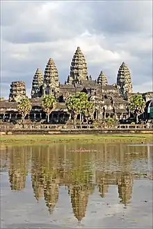 Camboya recibió la influencia del Hinduismo por primera vez durante el comienzo del Reino de Funan. El hinduismo era una de las religiones oficiales del Imperio jemer. Concretamente, era la más importante en popularidad, por delante del Budismo, y en Camboya se encuentra el templo sagrado de Angkor Wat, el templo hindú más grande del mundo.[13] Inicialmente, el reino veneraba al hinduismo como la principal religión del estado. Vishnu y Shiva eran las deidades más veneradas, adoradas en los templos hindúes jemeres. Templos como Angkor Wat se conocen en realidad como Preah Pisnulok (Vara Vishnuloka en sánscrito) o el reino de Vishnu, para honrar al rey póstumo Suryavarman II como Vishnu. Las ceremonias y rituales hindúes realizados por los brahmanes (sacerdotes hindúes), normalmente únicamente se realizan entre las elites gobernantes de la familia del rey, los nobles y la clase dirigente. El imperio jemer desarrolló una sociedad compleja donde florecieron la cultura, el arte y la arquitectura sofisticados. El rey jemer y sus funcionarios estaban a cargo de la gestión de la irrigación y la distribución del agua, que consistía en una intrincada serie de infraestructuras hidráulicas, como canales, fosos y enormes depósitos llamados barays. La sociedad estaba organizada en una jerarquía que reflejaba el sistema de castas hindúes, en el que los plebeyos —agricultores de arroz y pescadores— constituían la gran mayoría de la población. Los kshatriyas —la realeza, los nobles, los señores de la guerra, los soldados y los guerreros— formaban una elite gobernante y las autoridades. Otras clases sociales incluían brahmanes (sacerdotes), comerciantes, artesanos como carpinteros y canteros, alfareros, metalúrgicos, orfebres y tejedores de textiles, mientras que en el nivel social más bajo se encontraban los esclavos. Los extensos proyectos de irrigación proporcionaban excedentes de arroz que podían servir de apoyo a una gran población. La religión del estado era el hinduismo pero influida por el culto a Devaraja, que elevaba a los reyes jemeres a la categoría de poseedores de la cualidad divina de dioses vivientes en la tierra, atribuida a la encarnación de Vishnu o Shiva.[14] En política, este estatus se consideraba como la justificación divina del gobierno de un rey. El culto permitió a los reyes jemeres embarcarse en proyectos arquitectónicos masivos, construyendo majestuosos monumentos como Angkor Wat y Bayón para celebrar el gobierno divino del rey en la tierra.