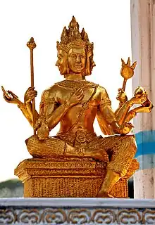 La ciudad tailandesa, Ayutthaya, cerca de Bangkok, se llama así por Ayodhya, el lugar de nacimiento de Rama. Numerosos rituales derivados del brahmanismo se conservan en los rituales, como el uso de cuerdas sagradas y el vertido de agua de las conchas. Además, las deidades hindúes son adoradas por muchos tailandeses junto con el budismo, como Brahma en el famoso santuario de Erawan, y se encuentran estatuas de Ganesh, Indra y Shiva, así como numerosos símbolos relacionados con las deidades hindúes, por ejemplo, Garuda, un símbolo de la monarquía. Los relieves de las paredes de los templos, como el de Prasat Sikhoraphum, del siglo XII, cerca de Surin (Tailandia), muestran una Shiva danzante, con imágenes más pequeñas de Parvati, Vishnu, Brahma y Ganesha.[45]