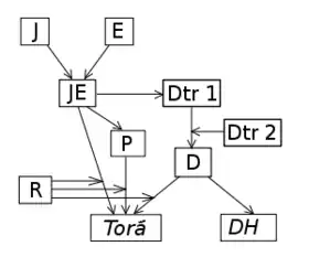 Las cuatro fueron combinadas por una serie de "redactores" (editores), primero J con E para formar JE, luego JE con D para formar el texto JED, y finalmente JED con P para formar JEDP, la Torá final. Retomando una tradición académica que se remonta a Spinoza y Hobbes, Wellhausen llamó a Esdras el redactor final, el líder del post-exilio, quien restableció la comunidad judía en Jerusalén a instancias del emperador persa Ciro en el 458 a. C.
