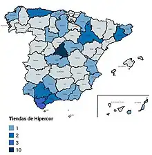 Hipercor es una red de hipermercados de España, perteneciente al grupo El Corte Inglés. Tiene su sede en el edificio corporativo de Madrid.[3][4] En 2017 fue fusionado por absorción con su matriz, y desde entonces comparte secciones con los grandes almacenes para evitar duplicidades, reduciendo la sala de ventas por debajo de los 10 000 metros cuadrados, manteniendo la marca y los empleados.[5]