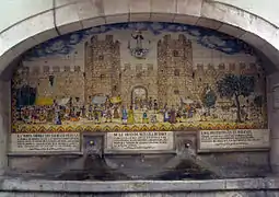 La creación de estos nuevos barrios obligó a ampliar el perímetro amurallado, por lo que en 1260 se construyó una nueva muralla desde San Pedro de las Puellas hasta las Atarazanas, cara al mar. El nuevo tramo era de 5100 m, y englobaba un área de 1,5 km².[132] El recinto contaba con ochenta torres y ocho puertas: San Daniel, Campderà —posterior Portal Nuevo—, Jonqueres, Orbs —luego Portal del Ángel—, Santa Ana, Portaferrissa, Boquería y Trentaclaus.[133] También se construyó en la periferia urbana un entramado de fortificaciones para la defensa de la ciudad, como el castillo del Puerto, en Montjuic; los de Martorell y Castellví de Rosanes, en la entrada del río Llobregat; los de Eramprunyá (Gavá) y Castelldefels en el delta del mismo río; y el de Montcada en la entrada del río Besós.[134]