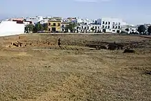 El poblamiento más antiguo en el espacio que actualmente ocupa la ciudad de Carmona, corresponde a la zona de Campo Real. Campo Real es un yacimiento situado sobre la primera elevación de la cornisa de los Alcores al sudoeste del casco histórico de Carmona, separada de ésta por una profunda depresión. Las principales referencias documentales provienen de las excavaciones realizadas por Jorge Bonsor en 1898 en las que descubrió un total de 42 silos excavados en la roca que contenían, en algunos casos, enterramientos. La datación de este yacimiento parece moverse entre el Neolítico final y el Calcolítico inicial, aunque perduró durante todo el período Calcolítico, lo que lo convertiría en coetáneo al ubicado en el casco histórico de Carmona.