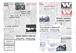 El gobierno polaco impuso la censura y los medios de comunicación oficiales dijeron poco sobre los "disturbios laborales esporádicos en Gdansk"; como una precaución extra, todas las conexiones telefónicas entre la costa y el resto de Polonia fueron pronto cortadas;[4] sin embargo, el gobierno no logró contener la información: se propagó una ola de "samizdats",[13] incluyendo el periódico Robotnik (El Trabajador) y rumores, junto con las trasmisiones de Radio Free Europe que penetraban la Cortina de Hierro,[14] asegurando que las ideas del emergente movimiento Solidaridad fueran rápidamente difundidas.