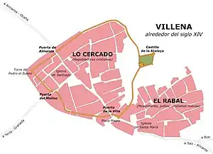 Los nuevos pobladores cristianos que fueron llegando a Villena desde el momento de la conquista cristiana se establecieron alrededor de la actual iglesia de Santiago, como demuestra el tipo de urbanismo ortogonal con las calles dispuestas en posición radial formando manzanas regulares con una parcelación clásicamente medieval.[27] El centro de la ciudad se trasladó a esta área, que posteriormente se amuralló por orden de don Juan Manuel, según se desprende de esta carta dirigida en 1308 a Jaime II: