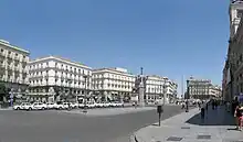 El ensanche de la Puerta del Sol fue una obra de gran envergadura. Los derribos de cerca de una treintena de casas acabaron el 1 de mayo de 1858. Realizadas las expropiaciones (en virtud de la Ley de Expropiación Forzosa) y posteriormente las demoliciones, se procedió a la venta de los terrenos edificables (algunos de los solares quedaron retratados por los fotógrafos Charles Clifford y J. Laurent).[53] Los cascotes resultantes de las demoliciones fueron a parar a los jardines del Moro. De todos los edificios antiguos solo quedó en pie la Casa de Correos y la Casa Cordero. Las ventas públicas de terreno hicieron que aparecieran en escena nuevos propietarios. Quien más terreno adquirió fue Fernández Casariego (compró cuatro locales), seguido de Juan Manuel Manzanedo (marqués de Manzanedo), esta situación hizo que se denominase a la Puerta del Sol de forma jocosa "el patio de Manzanedo". El resto de locales se repartió entre diversos dueños. El local más grande y caro fue el que adquirió Lamberto Fontanella entre la calle de Alcalá y la Carrera de San Jerónimo, local que se transformaría en el Hotel de París. El 5 de diciembre de 1858 se procedía a la construcción de la primera casa entre Preciados y Carmen; la subasta de locales finalizó el 18 de enero de 1860. Las demoliciones dejaron un aspecto tan desolador que el autor de novelas folletinescas Wenceslao Ayguals de Izco comparó la nueva Puerta del Sol con "otro Sebastopol bombardeado".[53]