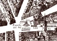 En los inicios del siglo XVI el espacio de la Puerta del Sol era un paso ensanchado con diversos edificios importantes, cada uno provisto de «lonjas» en las que se reunían los habitantes para comerciar con diversos productos, socializar con vecinos, enterarse de nuevas, divulgar noticias, etc. La importancia de la Puerta del Sol en el siglo XVI era escasa comparada con otras zonas de Madrid, mostrando las crónicas de la época que eran más relevantes la Plaza del Salvador (antecesora de la Plaza de la Villa), la Puerta de Guadalajara, y ante todo la Plaza Mayor.[1] La denominación de calle grande era habitual en los documentos de la época.[16] La calle ensanchada que es la Puerta del Sol de finales del siglo XV, fue empedrada y la repercusión del coste final de tal mejora acabó en disputa entre el Ayuntamiento y los primeros vecinos de la Puerta del Sol. Estos alegaban que la obra debía ser costeada por el Ayuntamiento, algo que este negaba.[23] El interés oficial respondía a una mejora del decoro y aspecto estético que mostraba la calle a las comitivas reales que habitualmente entraban en Madrid por la Puerta de Alcalá camino del Alcázar. Los vecinos tenían interés en mejorar la comodidad de acceso y tránsito por las calles. Las comitivas más importantes en esas primeras épocas fueron la entrada de Carlos V en la Villa, y de la misma forma su hijo Felipe II el 6 de enero de 1560. En el siglo XVIII existía una iglesia y hospital de la Inclusa para niños expósitos, ubicado en la calle Preciados. En las cercanías de la Puerta del Sol se fundó un convento de carmelitas calzados en 1573, sobre una antigua mancebía de la calle del Carmen, que había sido desalojada en 1541. A pesar de que su advocación era la de San Dámaso Papa, durante su historia fue más conocido por el nombre del Carmen Calzado. La iglesia y el convento fueron exclaustrados y desamortizados en 1836, quedando únicamente en funcionamiento la iglesia, que actualmente es la parroquia de Nuestra Señora del Carmen y San Luis.