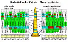 - Los sombreros dorados de Alemania, Francia y Suiza que datan del 1400 al 800 a. C. están asociados con la cultura de los campos de urnas de la Edad del Bronce. Los sombreros dorados están decorados con un Motivo en espiral del Sol y la Luna. Probablemente eran una especie de calendario utilizado para calibrar entre el calendario lunar y el solar.[14][15]